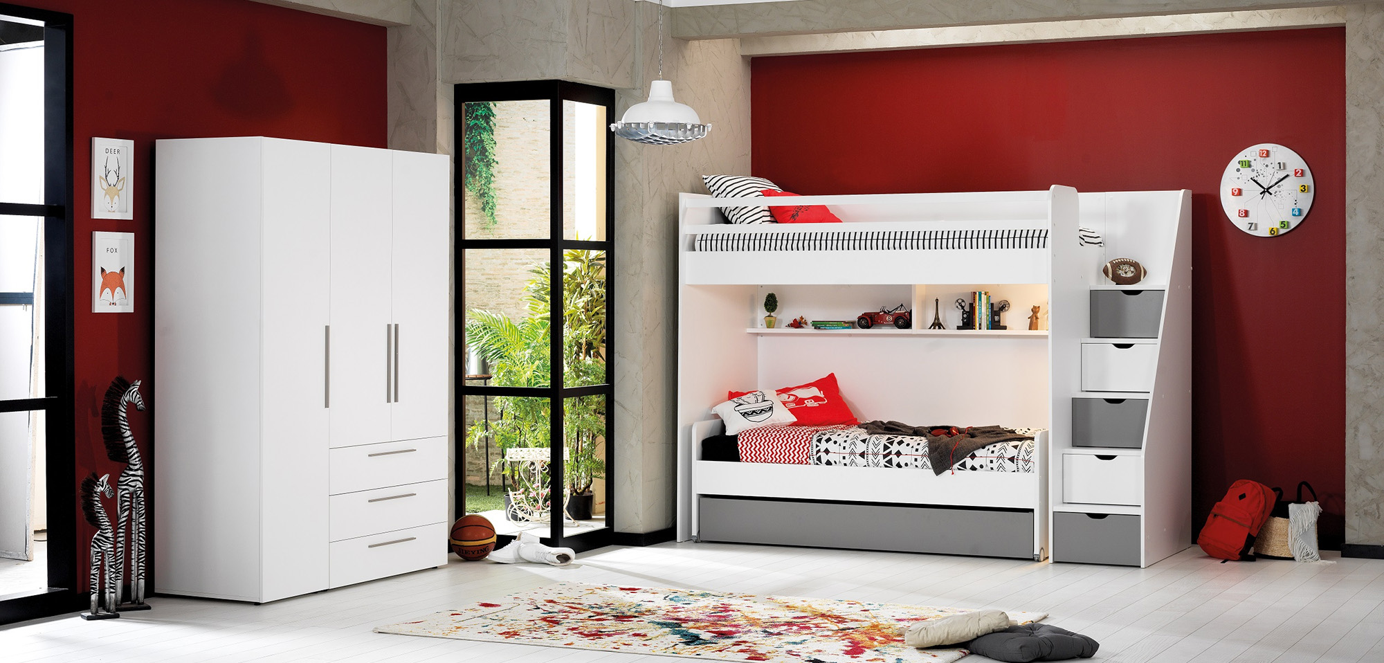 Relita SKY Etagenbett Buche Massiv Weiß Inkl. Regal & Rutsche – Zu 2 Einzelbetten Umbaubar