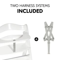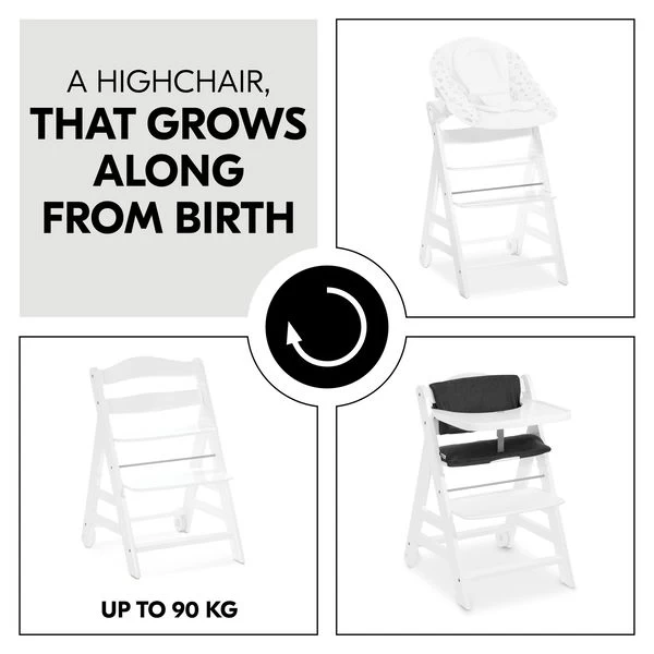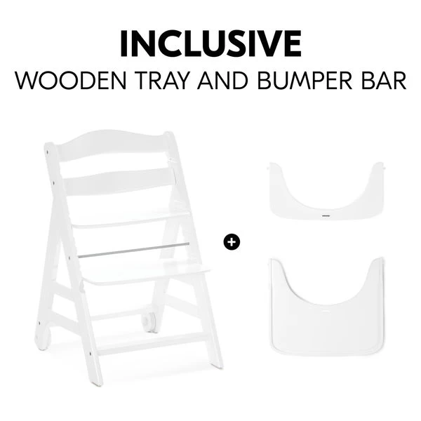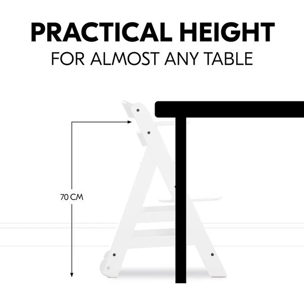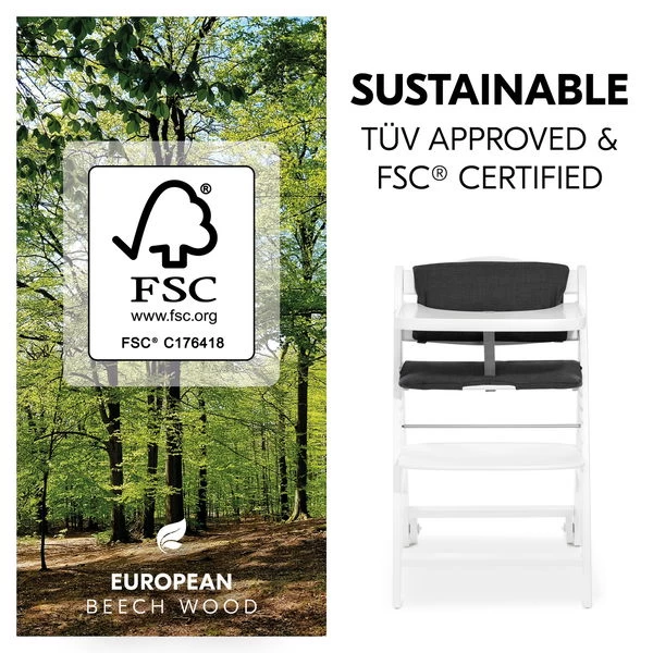Für Sicherheit sorgen der 5-Punkt-Gurt und der Schrittgurt, welche mit dem anderen Zubehör kompatibel sind. Auf dem großzügigen Holztisch hat dein Kind individuellen Freiraum zum Essen und Spielen. Alternativ kannst du den Tisch gegen den Vorderbügel austauschen und den Stuhl unter fast jeden Tisch schieben. Die im Set enthaltene Hochstuhlauflage besteht aus einem weichen Kissen für Rückenlehne und Sitz, welche deinem Kind erhöhten Sitzkomfort beim Essen und Spielen bieten.