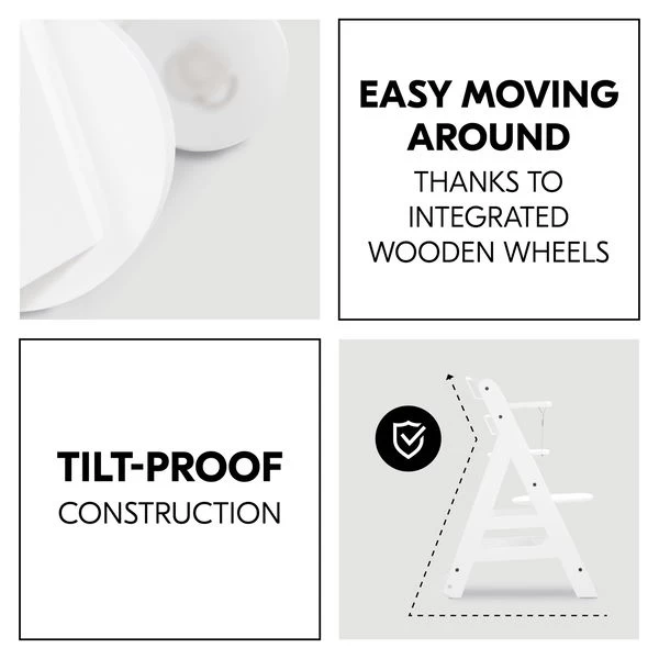 Dank der stabilen Konstruktion mit integrierten Rädern und Bodengleitern ist der Beta+ besonders kippsicher. Durch die verstellbare Sitz- und Fußplatte passt sich der Treppenhochstuhl an die Körpergröße deines Kindes an und ermöglicht eine bequeme Sitzposition in jedem Alter. Der Hochstuhl ist mit einer Maximalbelastung bis 90 kg ein zuverlässiger Begleiter für das ganze Leben.