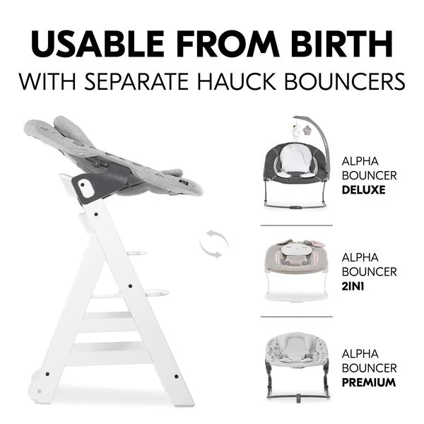 Kombiniert mit den separat erhältlichen Alpha Bouncer Babyaufsätzen, die auch als Babywippe nutzbar sind, ist dein Baby von Beginn an auf Augenhöhe mit der Familie.