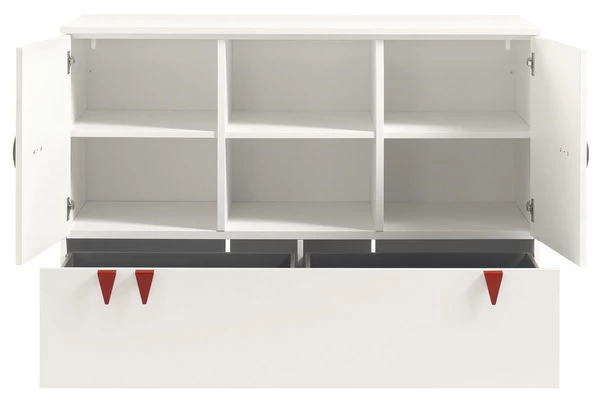 Die hülsta now! minimo Kommode ist mit 2 Türen, je 1 Einlegeboden, 1 Schublade und 2 offenen Fächern ausgestattet und bietet somit viel Platz für Windeln und Pflegemittel.