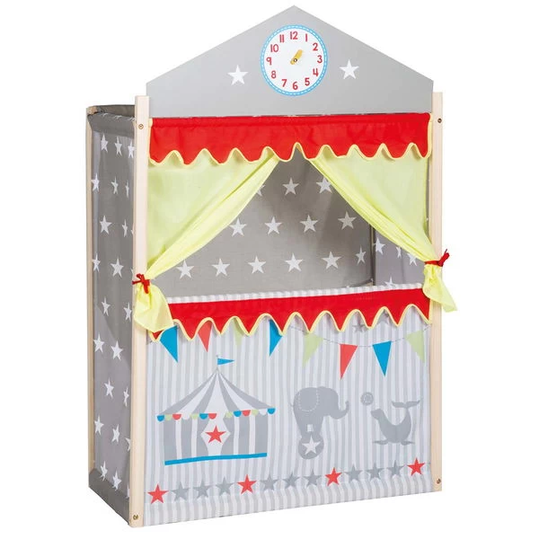 Das Roba Kasperletheater kann frei im Raum stehen und begeistert zwei Puppenspieler zugleich. Das Rollenspiel fördert die Kreativität Ihres Kindes und die mit Zirkusmotiven bedruckte Stoffbespannung bietet ein farbenfrohes Spielerlebnis. Natürlich darf ein Vorhang bei einem Theater nicht fehlen und eine Uhr zeigt Ihnen wann die Vorstellung beginnt.