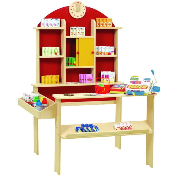 Der Roba Kaufladen verfügt über ein umfangreiches Zubehörset und ist inklusive Kasse. So hat Ihr Kind bereits alles um mit dem Verkaufen loszulegen. Der Kaufmannsladen ist auf kindgerechter Höhe und verfügt über eine zusätzliche seitliche Ablage. Die vielen Regalfächer bieten Stauraum für die vielen Verkaufsartikel. Das Kaufladenzubehör umfasst u. a. eine elektronische Kasse mit Lautsprecher, Mikrofon und Scanner sowie Bargeld, Geldkarte und kleinem Einkaufskorb.