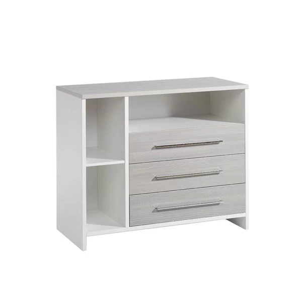 Wickelkommode mit abnehmbaren Wickelaufsatz, 1 offenes Fach, 3 lange Schübe mit Selbsteinzug, Seitenregal mit einem Regalboden.