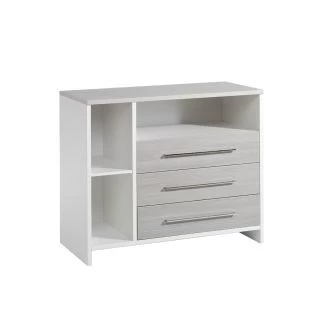 Zeitlose Eleganz mit klaren Linien. Die Kinderzimmerserie Eco gibt es jetzt auch in dezenter klassischer Farbgebung Holzdekor Pinie silber / Dekor weiß. Ein eleganter Blickfang sind die langen Chrom-Griffleisten, die ein leichtes Öffnen und Schließen ermöglichen. Die helle Farbgebung sorgt für eine fröhliche Atmosphäre und garantiert süße Babyträume. Seitenregale schaffen zusätzlichen Stauraum für kleine Schätze.