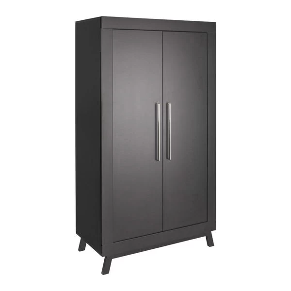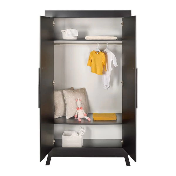 Der Schardt Miami black Kleiderschrank überzeugt durch modere Farbgebung. Der schwarze Korpus wird von einem schwarz lackiertem Massivholz-Fußgestell getragen.